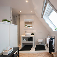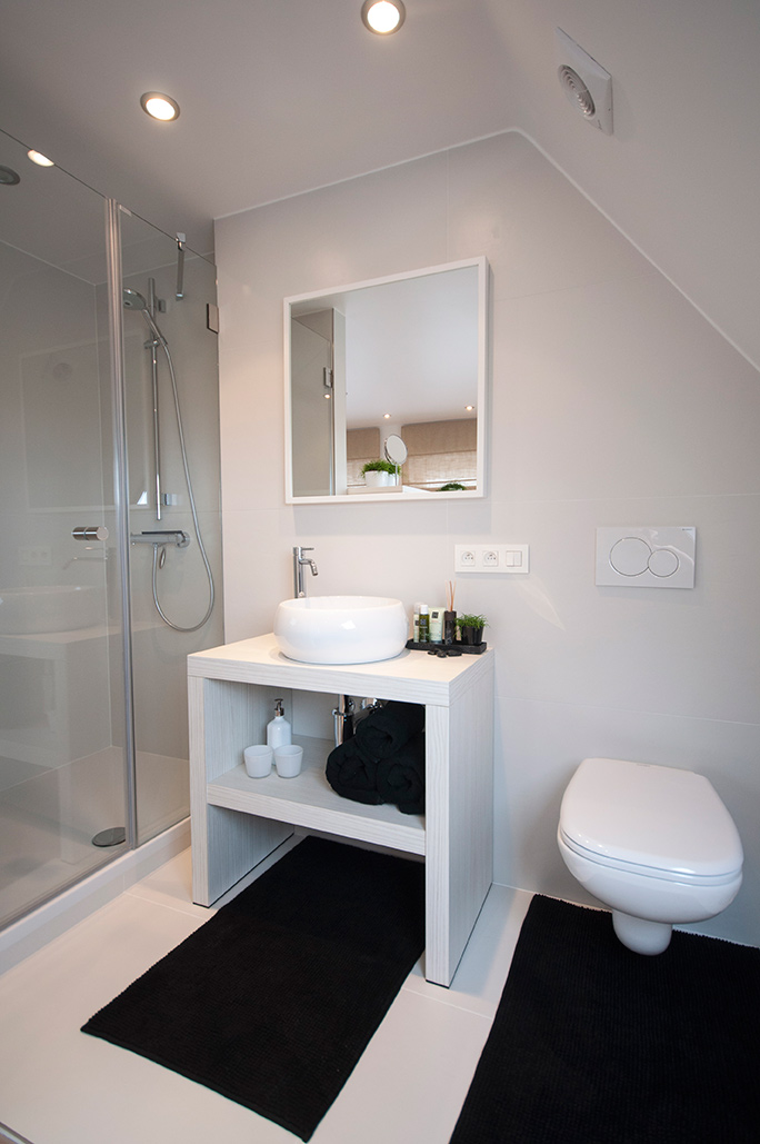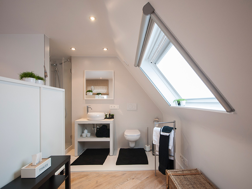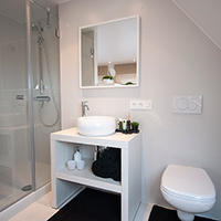 • Geïntegreerde badkamer met douche, wastafel, ingemaakte leg- en hangkast, toilet